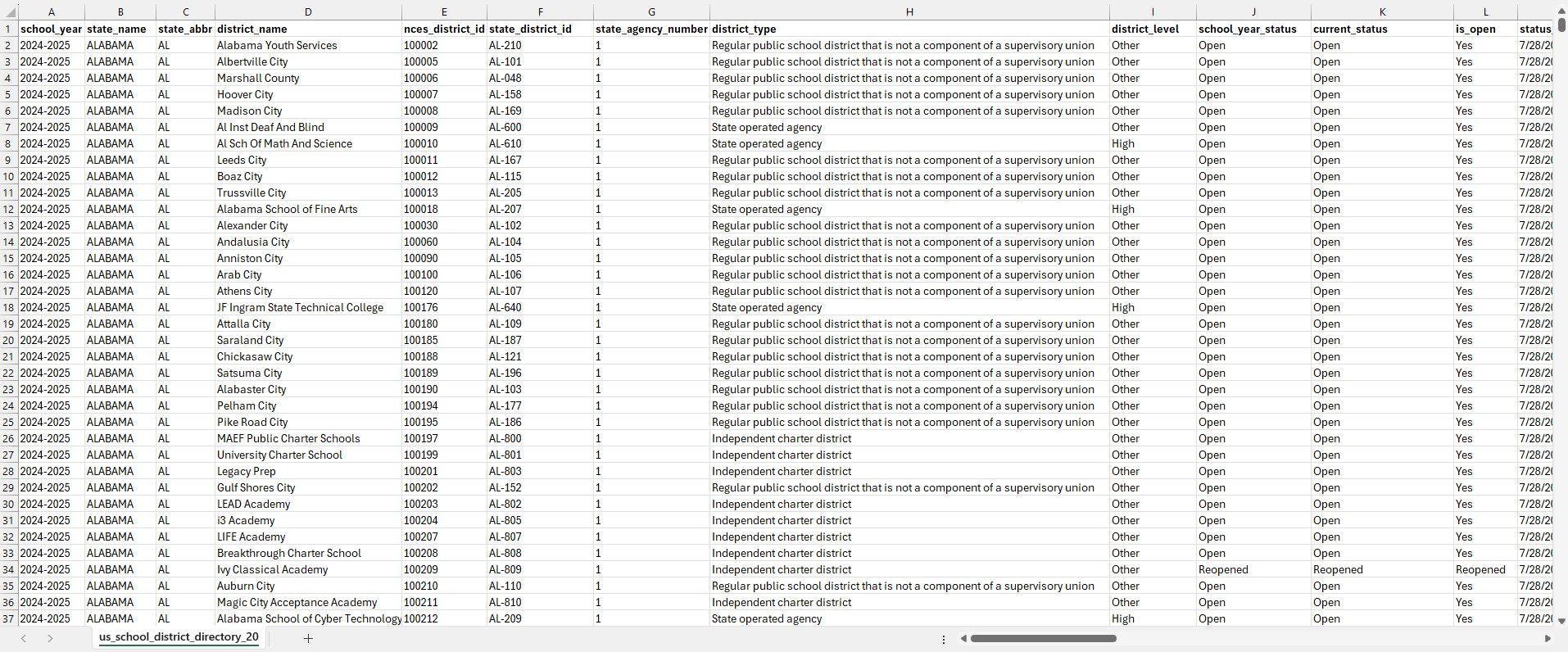 Built from official public education data and cleaned into a ready-to-use district directory format.